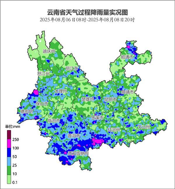 8月8日晚,中東部、南部、西部邊緣等地出現(xiàn)強降雨過程已結束,過程平均雨量26.1毫米,最大小時雨量94.6毫米,出現(xiàn)在昭通市鹽津縣廟壩鎮(zhèn)黃草站。